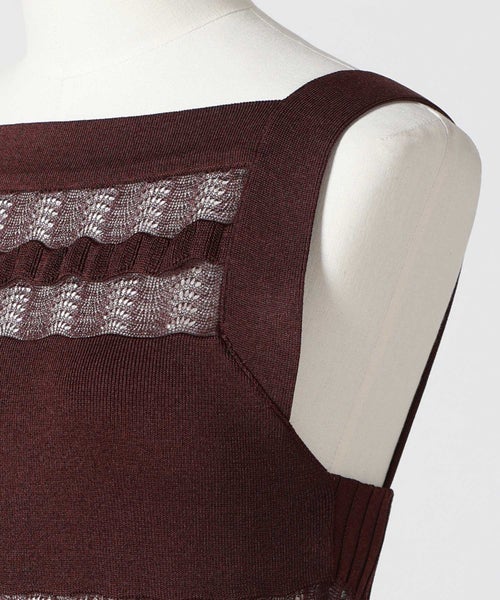 【デザイン】 FETICO(フェティコ)のドレス。光沢感のあるブライト糸と循環型プロセスで生産されたレース糸を組み合わせ、ボーダー状に編み立てた立体感のあるリブ組織と透け感のあるレース柄を特徴としたデザインです。体に沿う快適なシルエットで女性らしさを引き立て、バックデザインはすっきりとしたディティールで上品さを演出。軽やかで華やかな印象を与え、特別なシーンにも日常使いにもマッチする一着です。