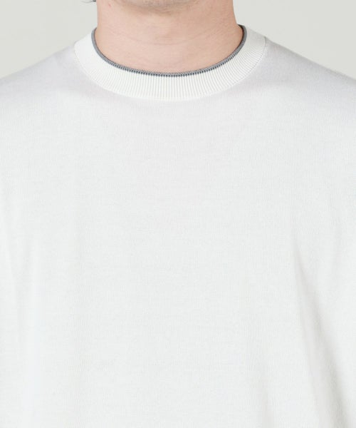 【デザイン】FILIPPO DE LAURENTIIS(フィリッポデローレンティス)のクルーネックニット。シンプルでミニマルなデザインながら、ネックラインに入ったラインがアクセントになっています。シンプルなデザインなのでアウターを選ばず、インナーとしても非常に優秀な一枚です。