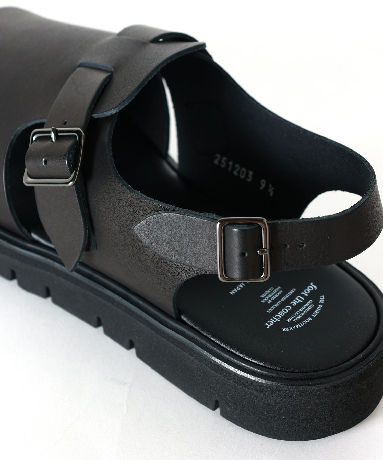【デザイン】 foot the coacher(フットザコーチャー)のサンダル。甲を覆うアッパーと程よいボリュームのあるソールが特徴的なオープントゥサンダルです。ソールにはVIBRAM社のGLOXI CUTを使用しており、軽量かつ耐久性に優れています。二箇所のベルトによるサイズ調節が可能。クッション性のあるインソールで履き心地も抜群です。素足でも、ソックス合わせでも、上品な雰囲気で楽しんでいただけるサンダルです。