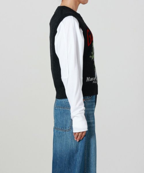 【デザイン】 GANNI(ガニー)のニットベスト。フロント中央には印象的なローズ柄グラフィックと“Have a nice day! Please recycle”のメッセージが添えられており、遊び心とメッセージ性を併せ持つデザインに。首元はラウンドネック、裾と袖ぐりにはリブ編み仕様でアクセントと構造性をプラス。シルエットはレギュラーフィットで、インナーにシャツやタートルネックを重ねやすく、レイヤードスタイルにもマッチ。グラフィックとクラシックなニットが融合した、存在感のあるベスト一着です。