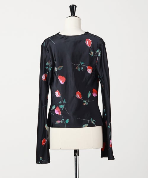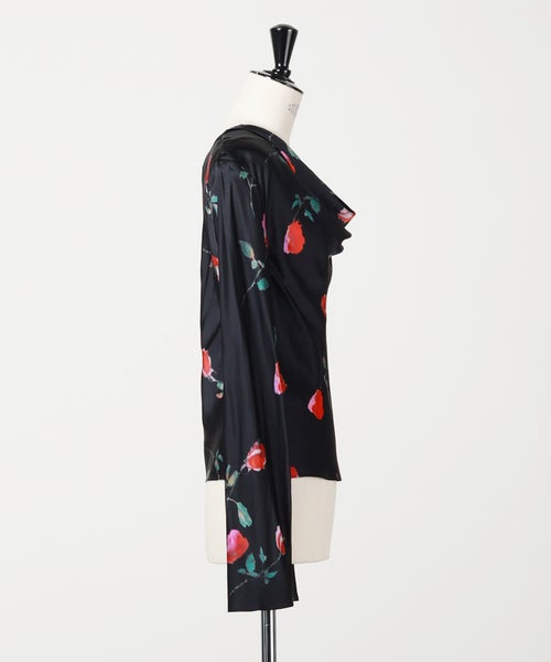 【デザイン】GANNI(ガニー)のブラウス。印象的な総柄プリントとサテンの上品な艶感が融合したモード感漂うアイテムです。顔まわりをすっきりと見せる特徴的なネックラインと、生地の落ち感によって自然に縦のラインが強調されることで自然とスタイリングに奥行きが生まれます。ボトムス次第でカジュアルにもオフィスシーンにもご着用いただけます。