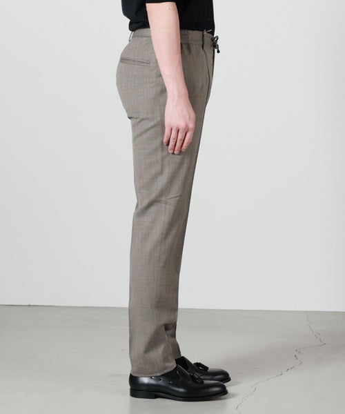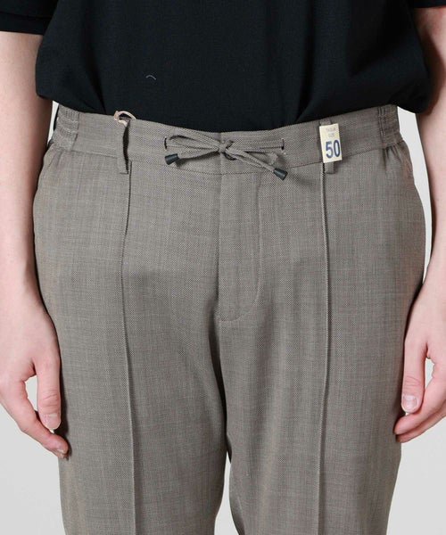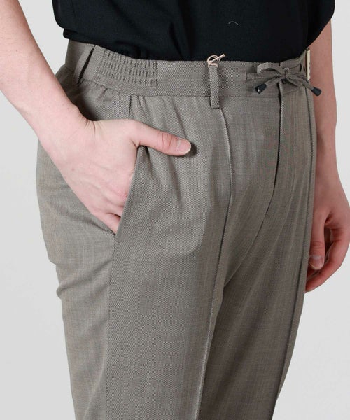 【デザイン】 giabsarchivio(ジャブスアルキヴィオ)のパンツ。定番人気となったジャージーパンツ『MASACCIO(マサッチョ)』です。リラックスパンツながらも美しいスリムテーパードシルエットを採用しており、きちんと感と楽ちんな穿き心地を両立。フロントにはシャープな印象を強調するクリースラインのステッチが施されており、脚長効果も抜群です。ドローコードとベルトループが兼備されているため、カジュアルシーンだけでなく、ドレス風のコーディネートにもすんなり取り入れることが出来る優秀な一本に仕上げられています。