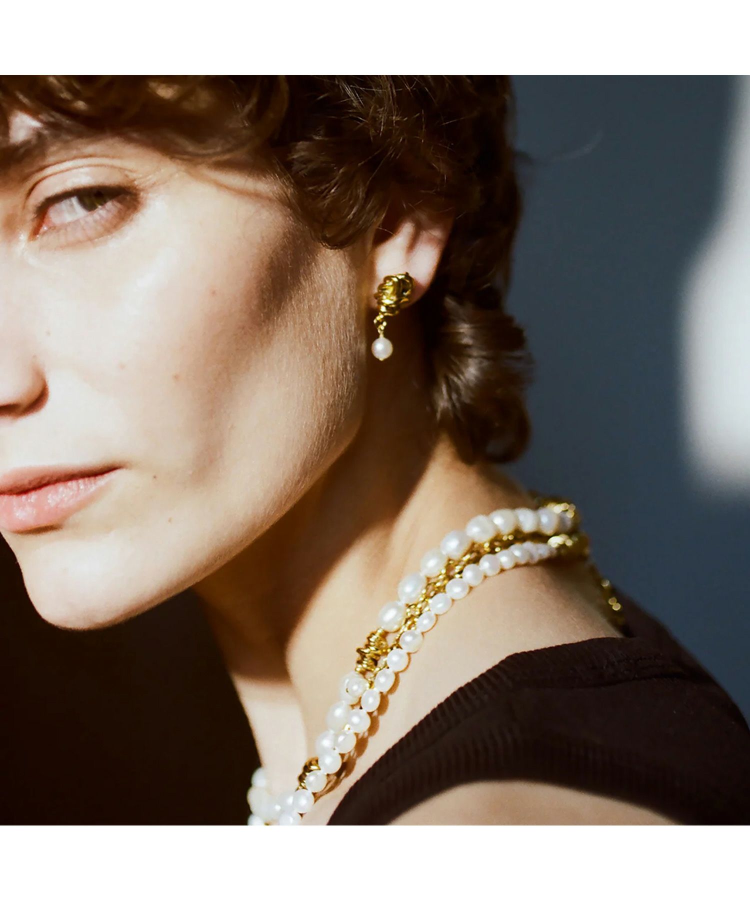 【素材】ジュエリーは24金メッキを施した真鍮と、淡水パールで構成。軽やかな着け心地ながら、しっかりとした存在感があり、滑らかで繊細なパールの質感が肌に馴染みます。見る角度によって変わる光沢が、エレガントな印象を引き立てます。
