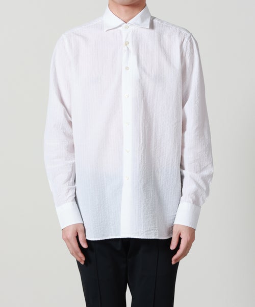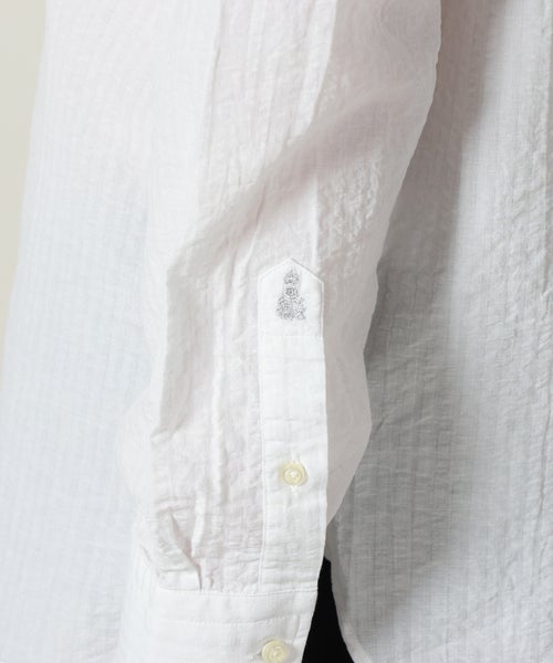 【デザイン】GUY ROVER(ギローバー)のシャツ。リラックスしたシルエットで、夏にも着用していただける、長袖のシアサッカーシャツです。大きめのシアサッカーの凹凸と、上品な奥行きのあるストライプの織り柄が静かな存在感を放ちます。左袖の剣ボロ部分には、王冠とアザミの花をモチーフとしたロゴマークが刺繍されており、イタリアらしい遊び心を添えています。前立てのボタンをいくつか開けても様になる襟型なので、様々な着こなしが可能です。季節感も存分に演出でき軽やかに決まる、夏のファッションに欠かせない一着。