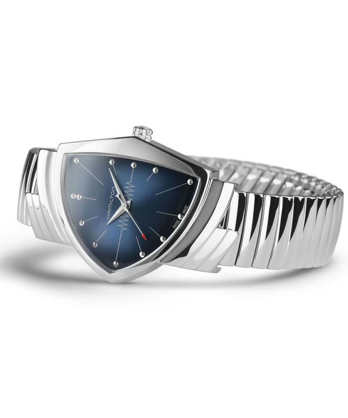 1957年、ハミルトンは世界初の電池式腕時計である「ベンチュラ」を発表しました。この革新的なタイムピースは、フューチャリスティックなデザインの象徴、そして革新のシンボルとしてその名を馳せ、ウォッチメイキングに新たな時代をもたらしました。エルヴィス・プレスリーの大ヒットシングル『ブルー・スエード・シューズ』にインスパイアされた「ベンチュラ」は、ニッケルの時針、分針、秒針を備え、高い信頼性を誇るクォーツムーブメントを搭載しています。アイコニックな三角形のステンレススチール製ケースにはフレックスブレスレットが組み合わされ、ディープブルーのダイヤルがエルヴィスの有名なシューズを思い起こさせます。