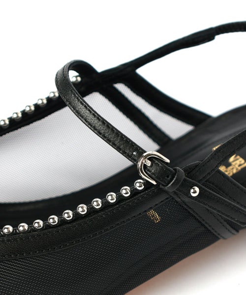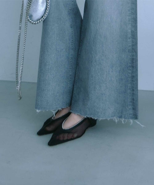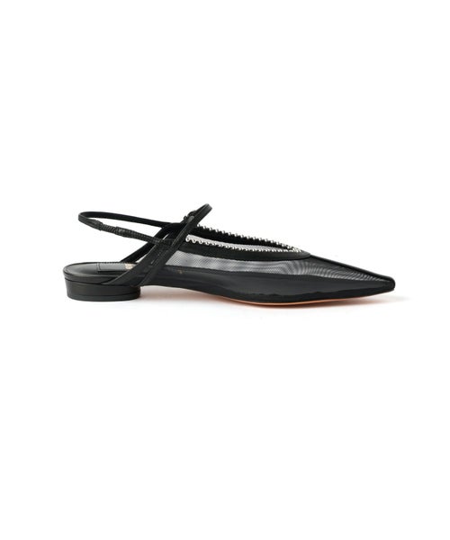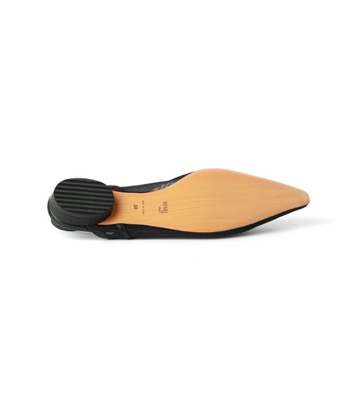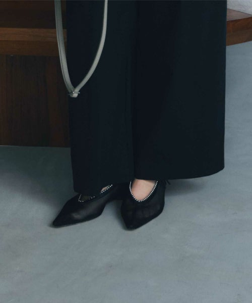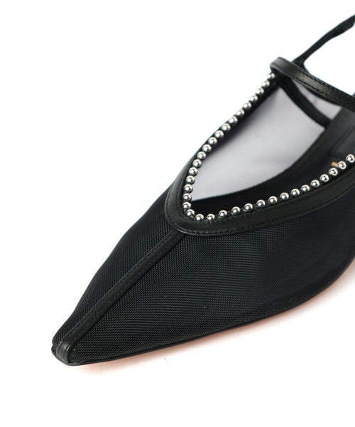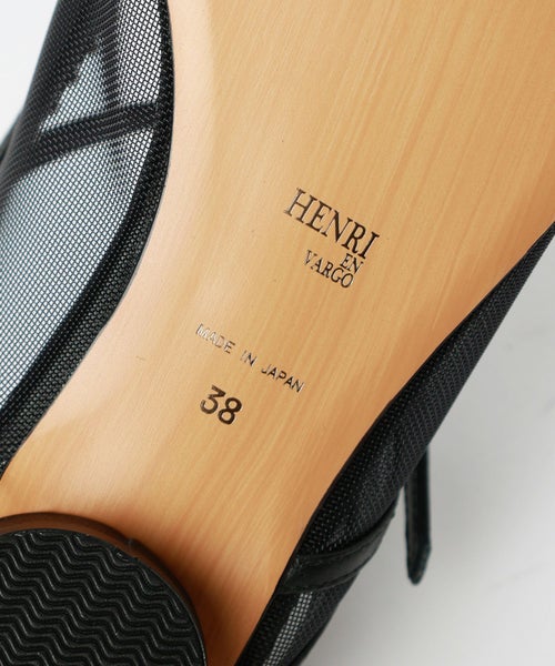 【デザイン】 HENRI EN VARGO(ヘンリエンヴァーゴ)のミュール。シャープなポインテッドトゥに、程よい透け感のあるメッシュ素材を組み合わせたアイテム。トレンドの「透け感」と「軽やかさ」をフェミニンに表現し、涼しげで洗練された足元を演出します。履き口にあしらったシルバースタッズが、甘くなり過ぎない程よいエッジをプラス。ストラップ付きで安定感があり、見た目だけでなく履き心地にも配慮した一足です。