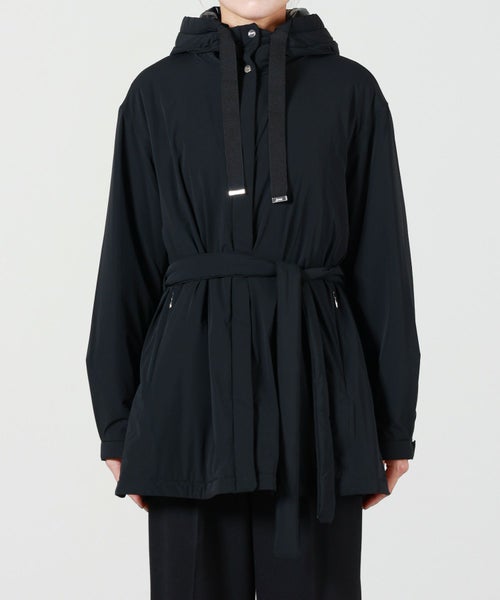 【デザイン】HERNO(ヘルノ)のジャケット。クリーンなシルエットに、グログランテープのウエストベルトでフェミニンなニュアンスをプラスした一着。ややゆとりのあるボックスシルエットは、ベルトの締め方ひとつで表情が変わり、スタイリングの幅が広がります。立体的に仕立てられたフードや、控えめな光沢感が、シンプルながらも上質感を引き立て、後ろ姿まで美しく演出。スポーティさを抑えた都会的佇まいな大人のためのモダンアウターです。