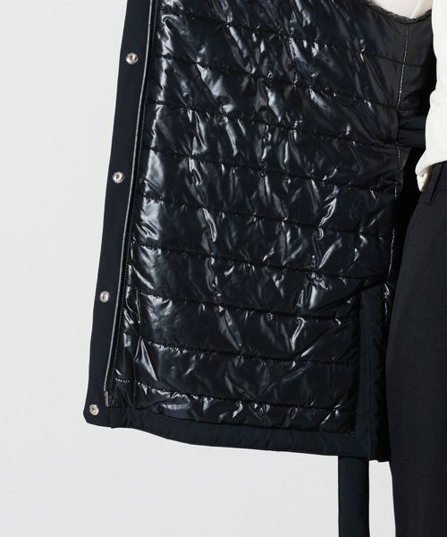 【素材】しなやかで軽やかなナイロンベースの表地は、ストレッチ性を持たせたラミネート加工により、動きやすさと快適な着心地を両立。内側には中綿を封入したキルティングライナーを配し、すっきりとした見た目ながらしっかりとした保温性も確保しています。