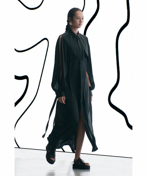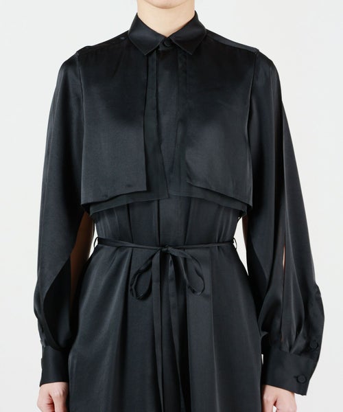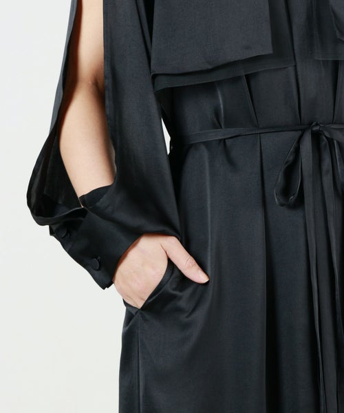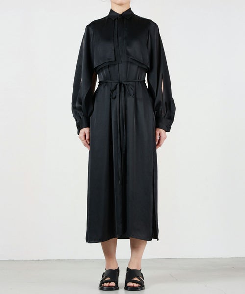 【デザイン】 HYKE(ハイク)のワンピース。トレンチコートからインスピレーションを得てデザインされており、ヨークを連想させるレイヤード風のデザインが特徴的。袖に肌見せのディテールが配されており、女性らしさもプラスされています。