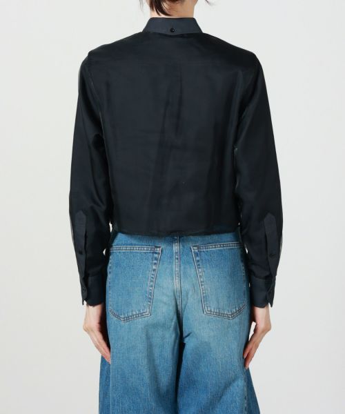【デザイン】 HYKE(ハイク)のシャツ。オックスフォードシャツにポリエステル素材のシアーシャツがレイヤードされたアイテム。トレンド感のあるクロップド丈に適度なシアーが魅力です。ほどよいハリのある生地がふんわりとした構築的なシルエットを演出します。