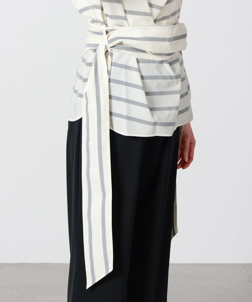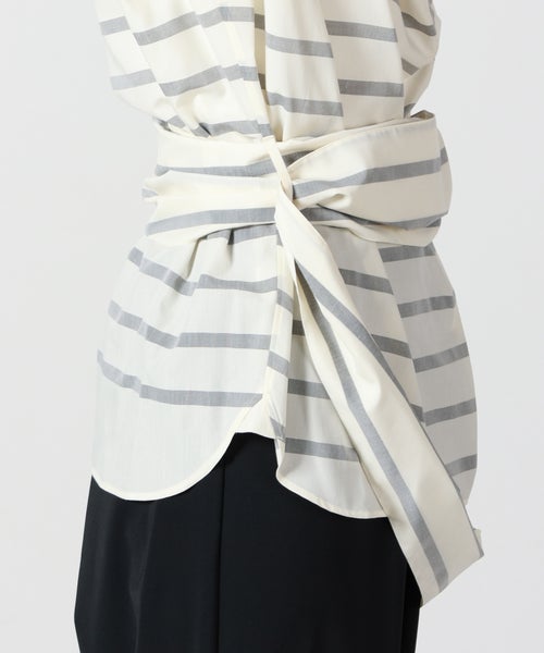 【デザイン】 HYKE(ハイク)のカットソー。首元が大きく開くデザイン性の高い一枚。単品で春夏の主役を任せられるアイテムに仕上がっています。ウエストには同素材の共布が付属し、ベルトとして着用が可能。巻く回数によってたらす布の長さを調整できるので、気分に合わせた着こなしが可能です。カジュアルな印象のボーダー柄ですが、絶妙な配色によってHYKEらしいデザインに。ワイドなボトムスと合わせて、タックインでの着用もおすすめです。