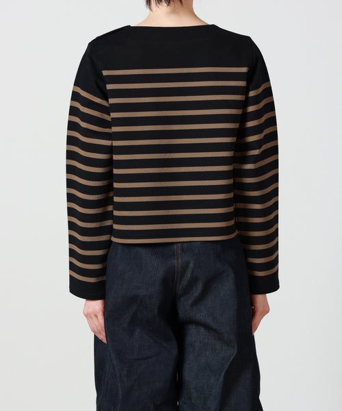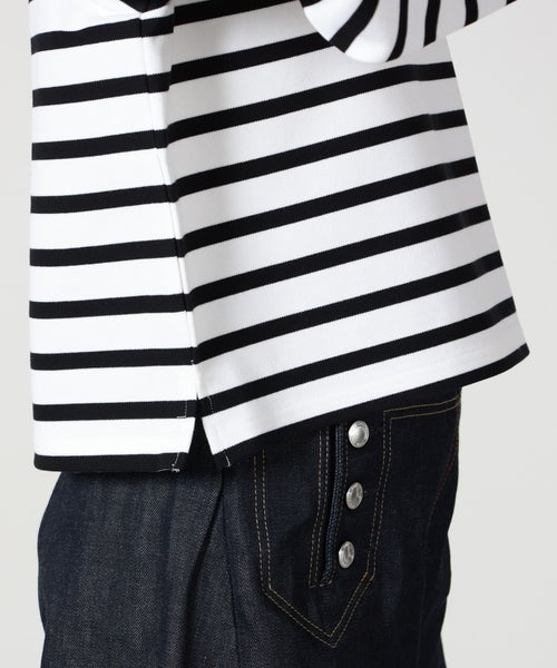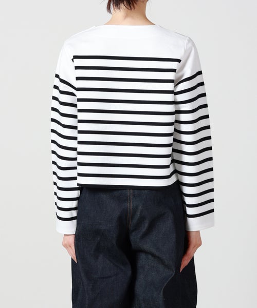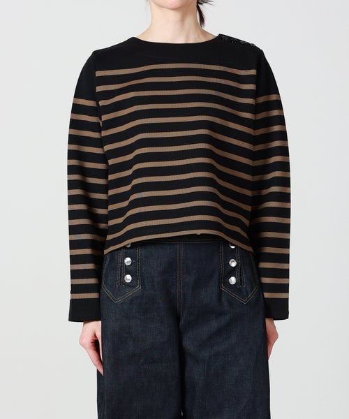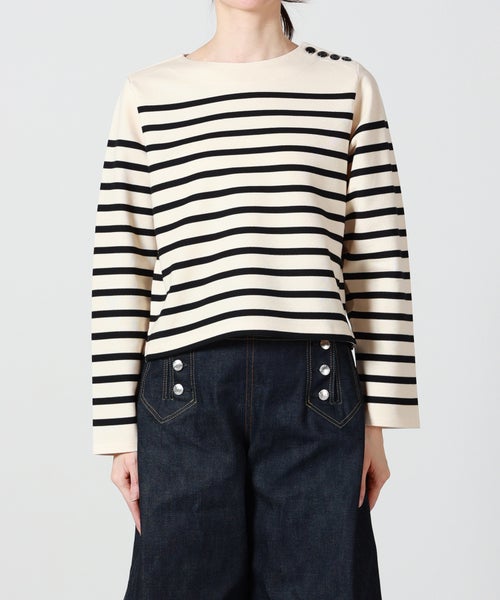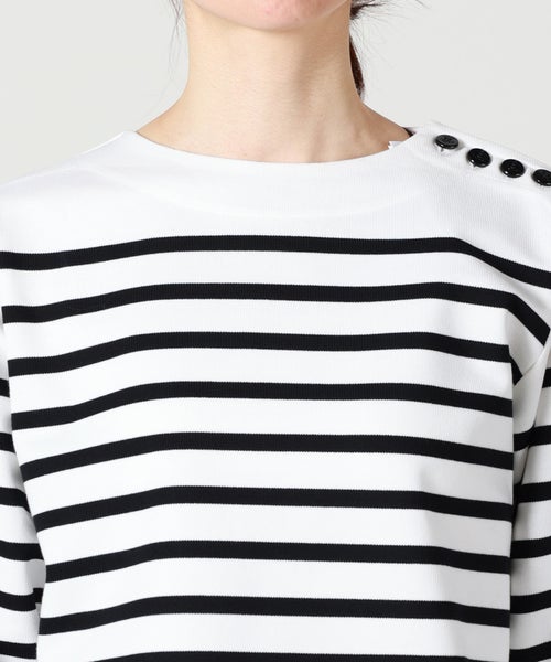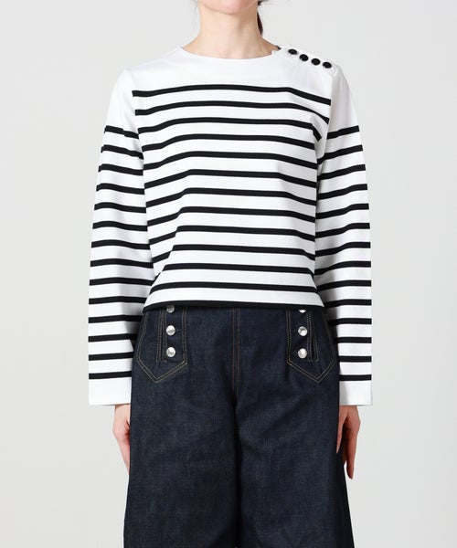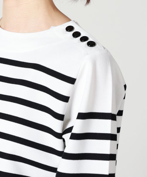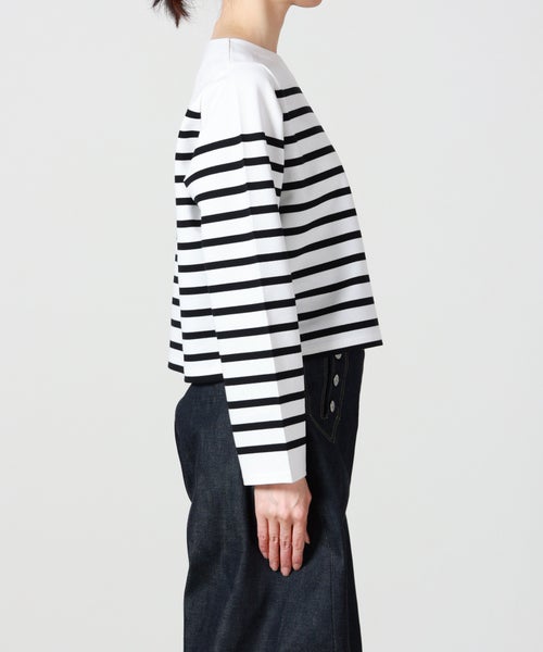 【デザイン】 HYKE(ハイク)のカットソー。バスクシャツからインスピレーションを得てデザインされており、ボーダー×クロップドデザインが春夏らしいアイテムです。左肩にあしらわれたボタンディテールがデザインアクセントに。