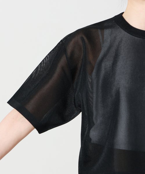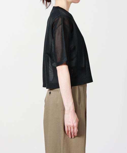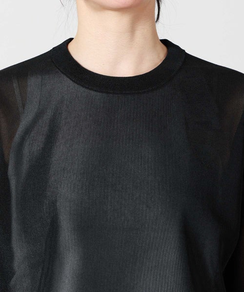 【素材】ナイロン55%、ポリエステル45%のシアー素材を使用。触れるとさらりとドライなタッチで、非常に軽やかな着心地が特徴です。見た目は繊細でクリアな透け感があり、涼しげでモダンな印象に。適度なハリ感を備えているため、薄手ながらもシルエットをきれいにキープします。通気性に優れロングシーズン活躍する一方、引っかかりやすい繊細な編地のため、アクセサリーやバッグとの摩擦にはご注意ください。