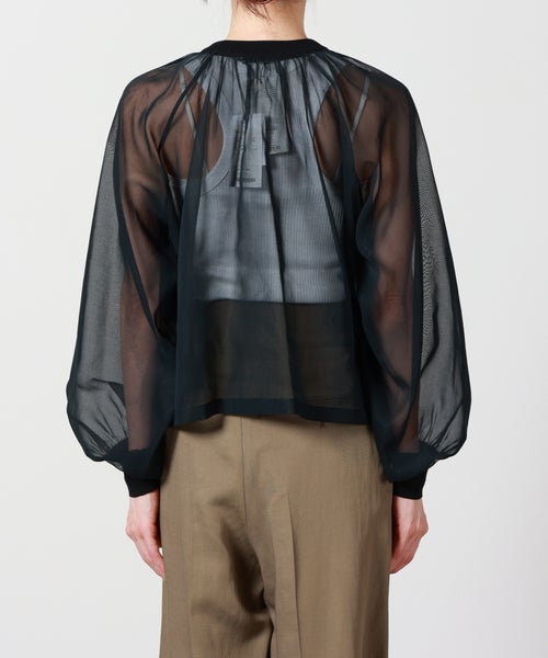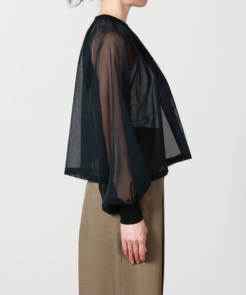 【素材】綿100%のコットンボイル素材を使用。触れるとさらりとしたドライタッチで、非常に軽く、肌離れの良い快適な着心地が特徴です。見た目にもほんのりと透けるエアリーな質感で、涼しげかつ上品な印象に仕上がっています。薄手で柔らかな風合いのため、着用時には自然なドレープが生まれ、軽快な動きを演出。繊細な素材特性上、濃色インナーの透けやアクセサリー等の引っかかりにはご注意ください。
