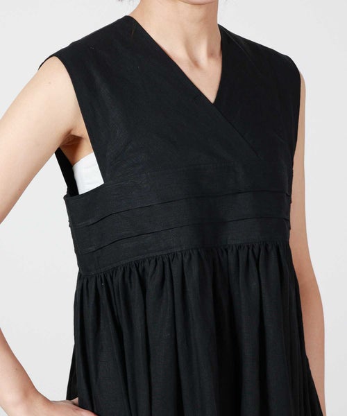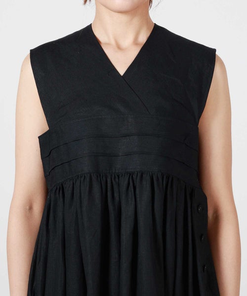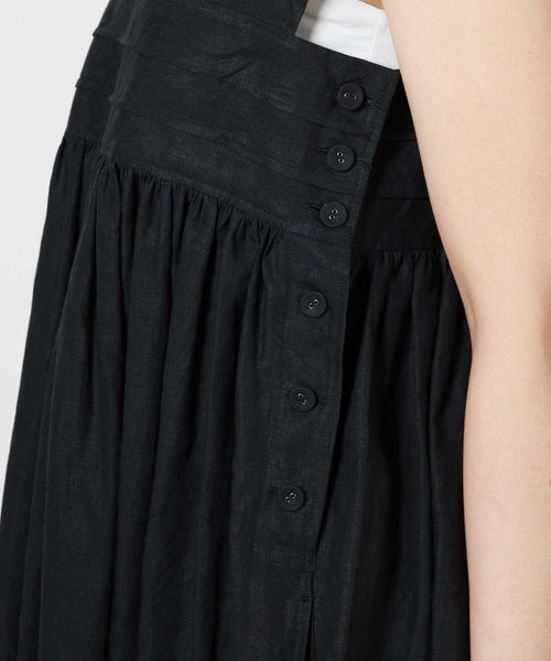 【デザイン】 HYKE(ハイク)のリネンマキシドレス。太めの肩紐がモードな印象のワンピースです。高めの位置で切り替え、ギャザーを寄せたデザインで、スタイルアップと体型カバーが叶います。サイドにあしらわれたボタンがアクセントに。1枚で着用頂くのはもちろん、レイヤードスタイリングにもおすすめです。