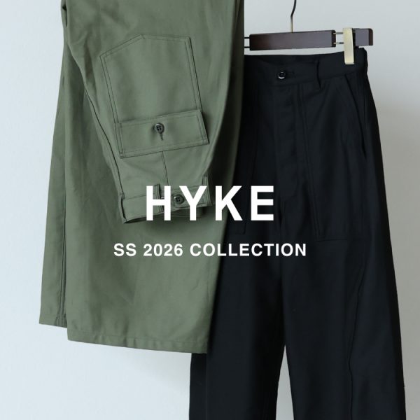 「HERITAGE AND EVOLUTION(服飾の歴史、遺産を自らの感性で独自に進化させる)」。をブランドコンセプトとし2013年に創立されたブランド。トレンチコートやデニムジャケット、ダッフルコートを始め多くのヒットアイテムを生み出しています。アウトドアスポーツで使用する服やミリタリー、ワークウェアなど野外で活動するために作られた素材やディティールから着想し、HYKE独自の感性を加えて再構築し、デザインされています。