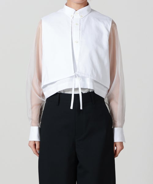 【デザイン】 HYKE(ハイク)のシャツ。クラシックなオックスフォードシャツに、透け感のあるスリーブデザインを掛け合わせたモダンな一着。クロップド丈にボレロをドッキングした二重構造の身頃が、立体的で奥行きのあるシルエットを生み出します。ボレロ部分にはドローコードを配し、絞ることでシルエットの変化を楽しめるのもポイント。ほどよいハリ感のある生地が、ふんわりとした構築的フォルムを美しくキープし、軽やかさとエレガンスを兼ね備えたデザインに仕上げています。