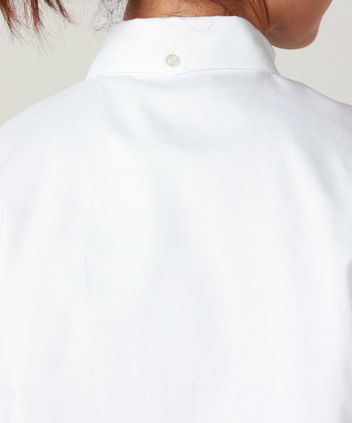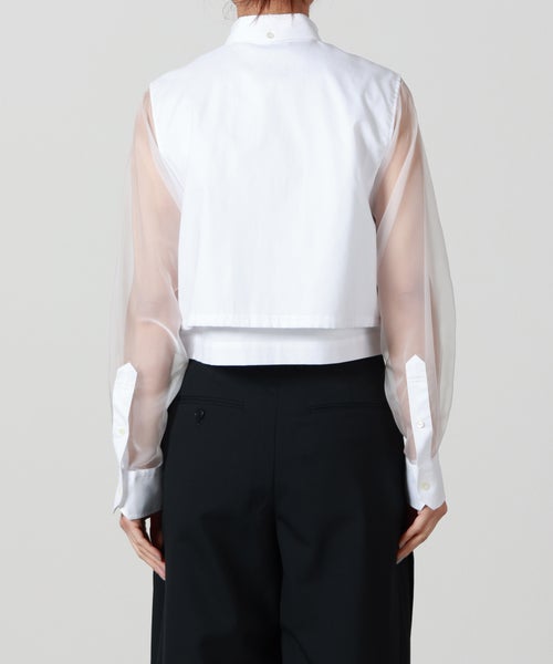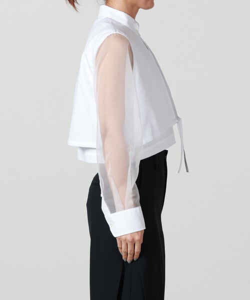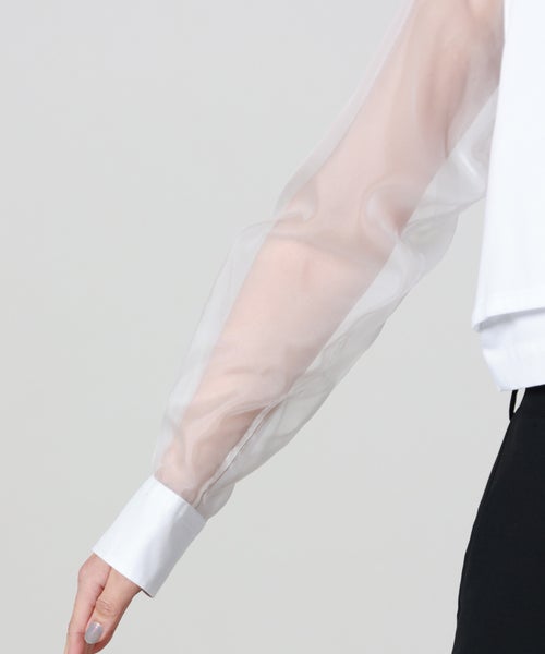 【素材】 身頃には、しっかりとしたハリと心地よい肌触りを兼ね備えたコットンオックスフォード生地を使用。快適な着心地と上質感を両立しています。袖部分にはポリエステルオーガンジー素材を採用し、軽やかでほんのり透ける質感が上品な印象をプラス。適度なハリと弾力性により動きやすさもあり、着用時にふわりとした華やかさを演出します。