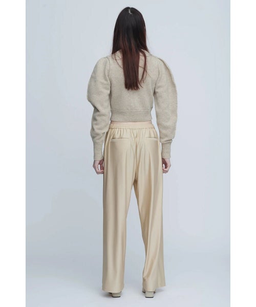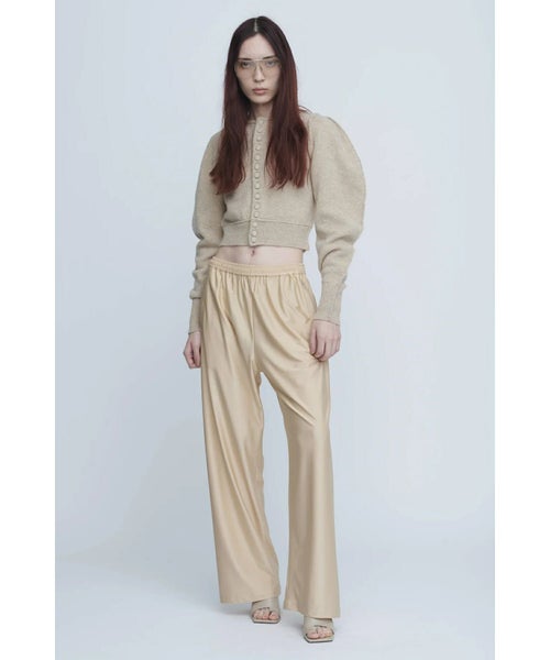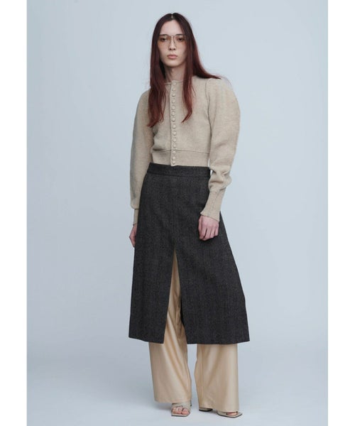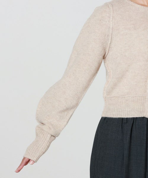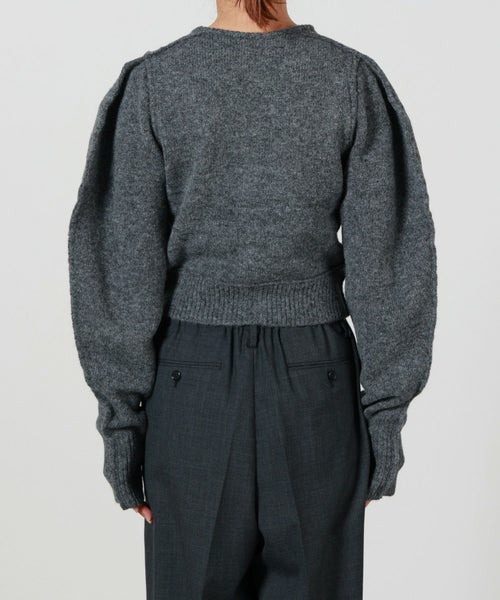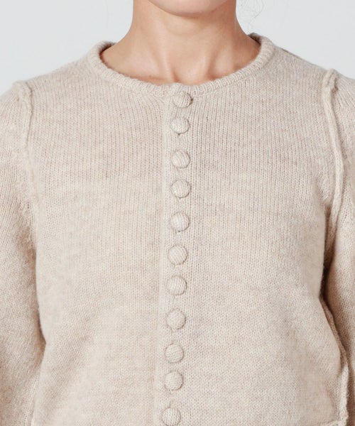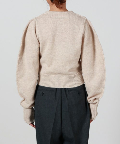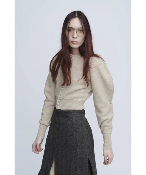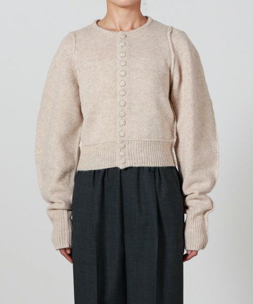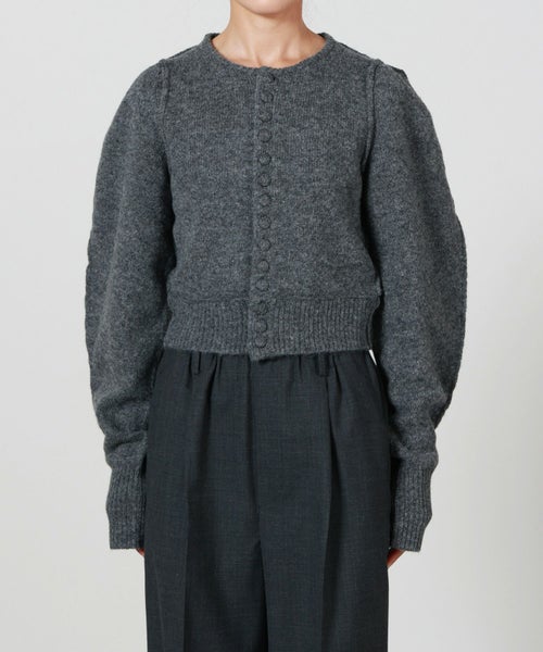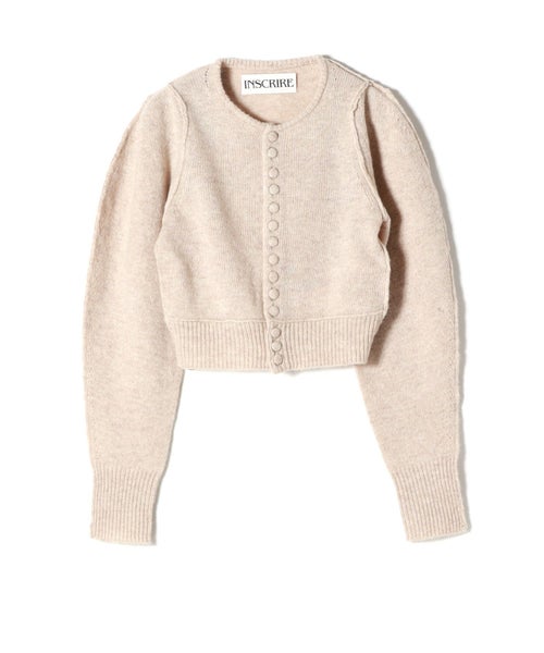 【デザイン】 INSCRIRE(アンスクリア)のカーディガン。肩幅を狭くタイトフィットなシルエットにし、袖のボリュームを持たせた特徴的なフォルム。ニットボタンも愛らしいデザインです。