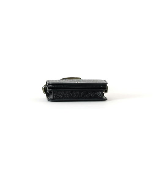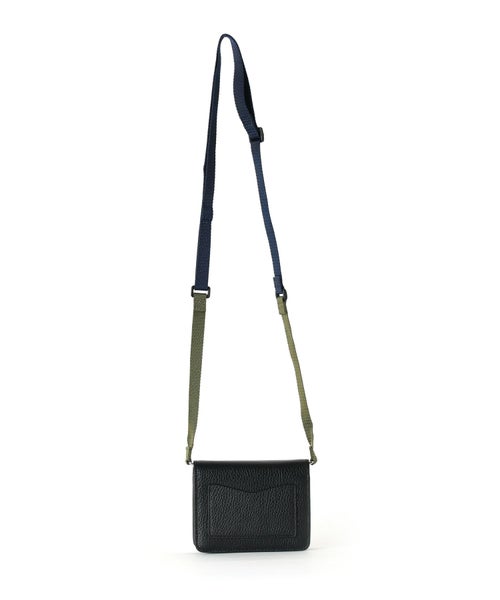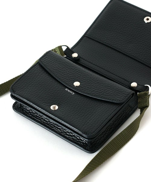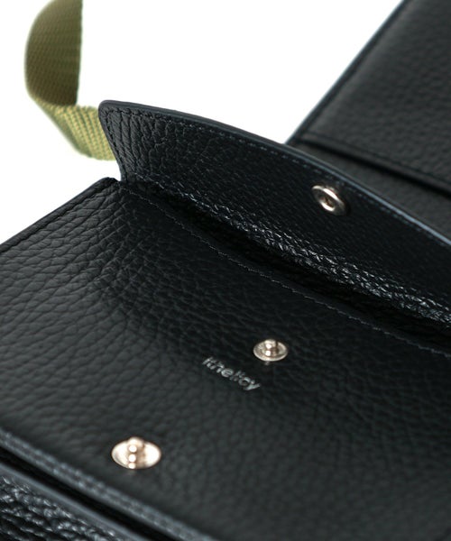【デザイン】 ithelicy(イザリシー)のバッグ。イタリアシュリンクを使用したミニショルダー。ミニマルなお財布としても使用できます。結んで好みの長さに調節できる革のショルダーと、カジュアルなテープショルダーが付いています。