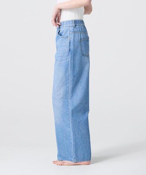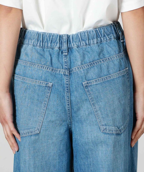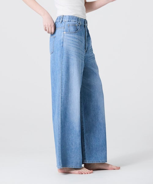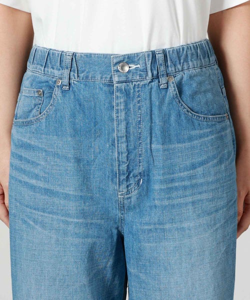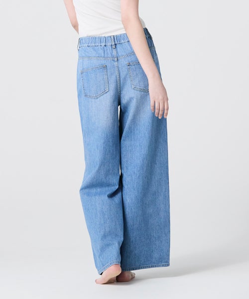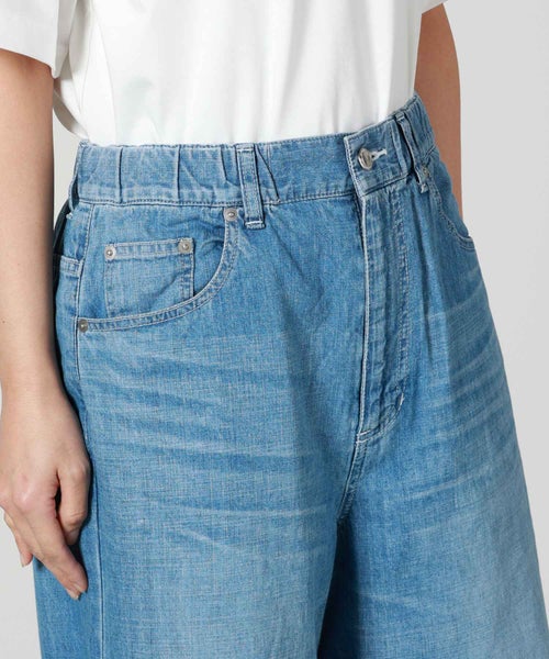 【デザイン】ウエストはゴム切替にドローコードを配し、ストレスフリーな穿き心地を追求したイージーワイドパンツ。締め付け感が少なく、体型の変化にも柔軟に対応する設計で、デイリーに気負わず着用いただけます。ベースはファイブポケット仕様の王道デザイン。流行に左右されない普遍的なディテールで、長く愛用できる一本に仕上げています。25SSの展開アイテムとはポケットのサイズと位置を微調整。ヒップがよりコンパクトに見えるよう設計をアップデートし、後ろ姿まで美しく整えました。ブリーチ加工により限りなく色を落とした、爽やかで涼しげなカラーリングもポイント。シンプルなトップスと合わせるだけで、夏らしい抜け感のあるスタイルが完成します。
