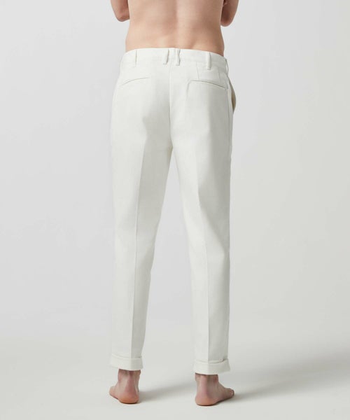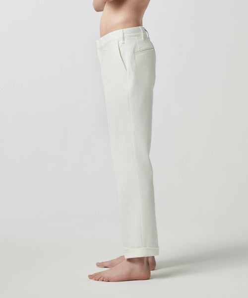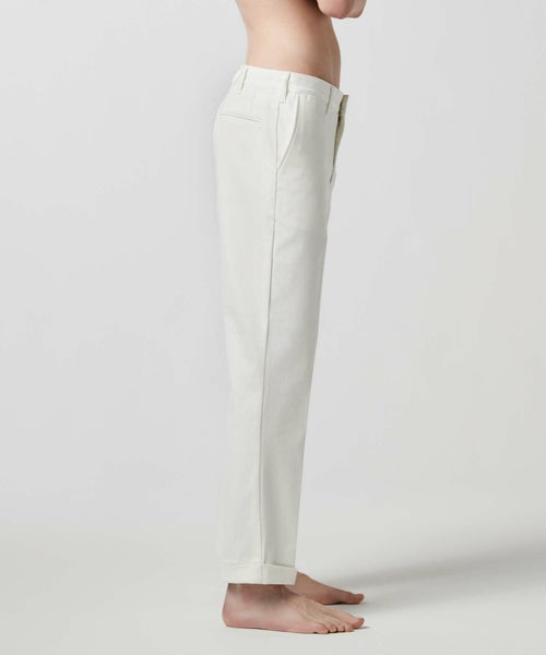 【素材】 生地は経糸に3種類のバージンコットンをブレンドした、COTTON USA認証のオリジナルのムラ糸を使用。緯糸にストレッチ糸を使うことで、快適な履き心地を実現しています。10ozの生地にすることで、毛羽が短い通年向けの生地となっています。