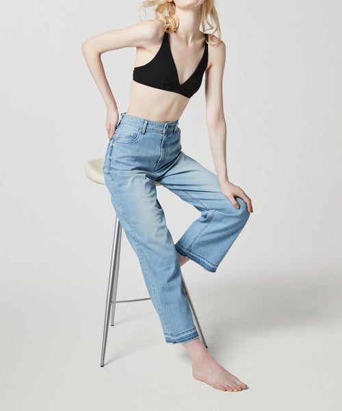 【デザイン】ハイライズのワイドシルエットながら、下半身をすっきり見せてくれる美脚シルエット。裾は洗いをかけてから三つ折りをほどく三巻ほどきにし、足元にアクセントをつけています。 全体的にクリーンな印象になるように、ステッチ色はホワイトを採用。バックポケットのYの刺繍だけ、ネイビーの糸を使用しています。