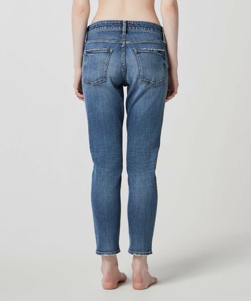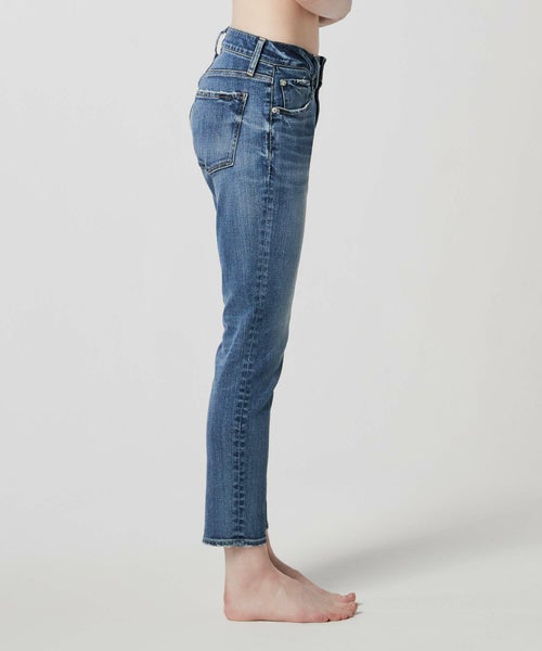 【素材】カイハラの3者混ハイパワーストレッチデニム地採用で、従来のポリウレタンストレッチより伸縮性も大幅にUPされています。縦目がしっかりと見える生地で、縦のラインが美しく、淡いカラーでも足が細く見せてくれます。全体にストーンオッシュによるしぼ感、細かい部分のダメージなど、こだわりあるメンズライクな加工感です。
