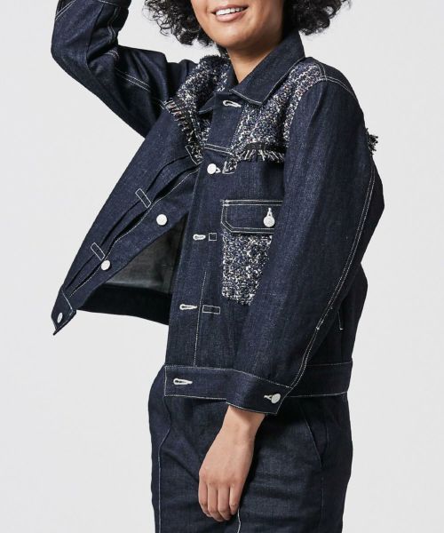 ヴィンテージ・デニムジャケットをベースにしたデザイン。COOHEMらしいマルチカラーのツィード、フリンジをデニム生地とパッチワークしました。綿をベースにした通年着られる素材感です。