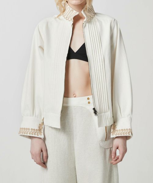 【デザイン】 LOKITHO(ロキト)定番のコード刺繍を使用したブルゾン。袖とカフスにコード刺繍を配置し、少し高めの襟と、長めのカフスでモード感のある仕上がりに。ウエストにゴムが入っており、コンパクトなシルエットが特徴。