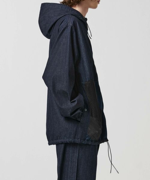 【デザイン】 マーカのアノラックジャケットをフルジップ仕様に変更したデニムジェケット。サイズ感もコンパクトに修正されています。前身頃にマットなメッシュ生地をハイブリッドすることで、モダンな印象に仕上げています。生地とウォッシュはマーカウェアのトラックパンツ(JD-PT51-23MKW))に合わせており、セットアップで着用することも可能。