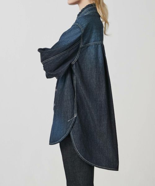 【デザイン】 23SSに即完売したデニムシャツが再入荷!ヴィンテージライクなデザインで、カジュアルながらモード感のあるデザインに仕上がっています。首元にあしらわれたフリルデザインで、さりげなく、顔回りを優しく華やかにしてくれます。特徴的なステッチ使いも目を惹き、全体のステッチはオフホワイトの白で統一し、輪郭とディテールをはっきりと作り上げています。 身頃のボリューム感に合わせた大きめなシルバーのドットボタンがアクセントに。裾は前後差とサイドにスリットがあり、インもしやすい仕様になっています。更に色落ちも場所によって変えており、より魅力を増す加工感もポイント。 羽織としても一枚でシャツとしても着用可能です。