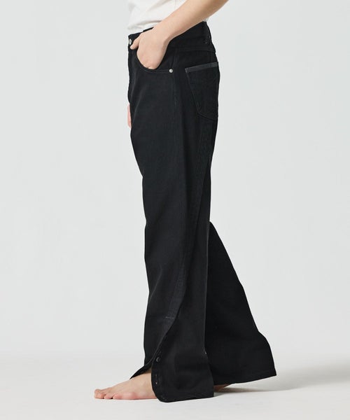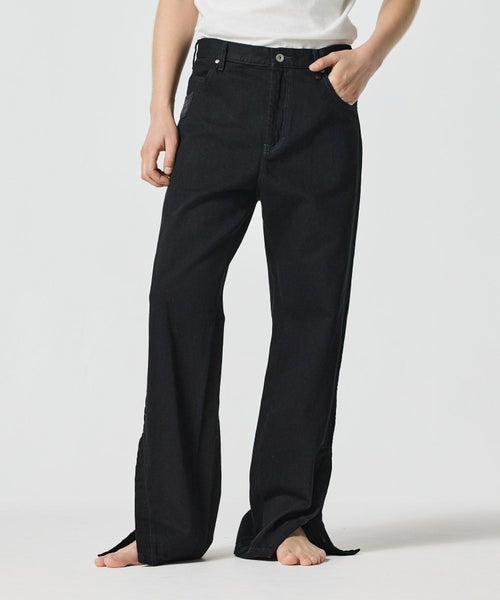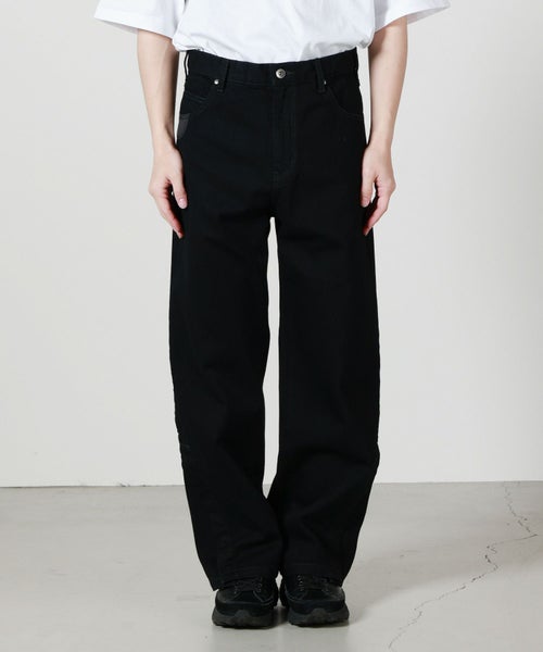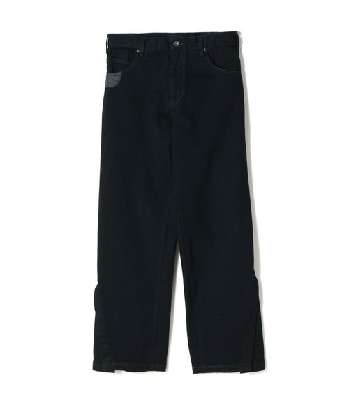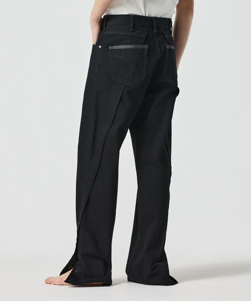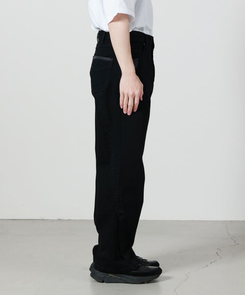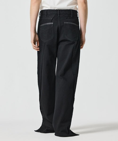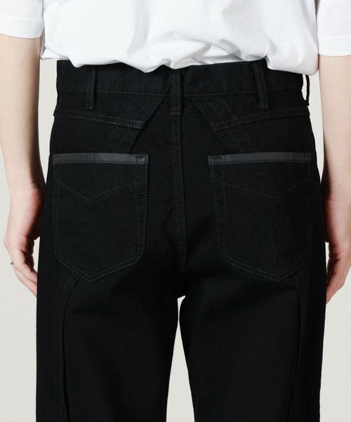 【デザイン】 1950年代ラングラーのペインターパンツのディテールを再構築したストレートデニム。後ろから回り込むように配置されたシームが特徴的で、裾にはボタン付きのスリットを配し、フレアシルエットとしても楽しめるデザイン。また、スリット部分のボタンホール間隔を広めに設定し、お直しがしやすい仕様にしています。斜めに配されたシームに沿って地の目を取ることで、経年変化により独特のあたりが生まれる工夫を施しています。タムらしくポケット部分にポリエステルリップストップ生地を使用し、モードで洗練された印象をプラス。