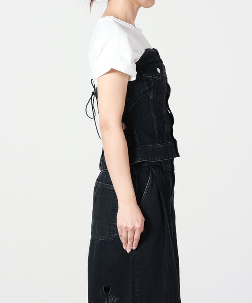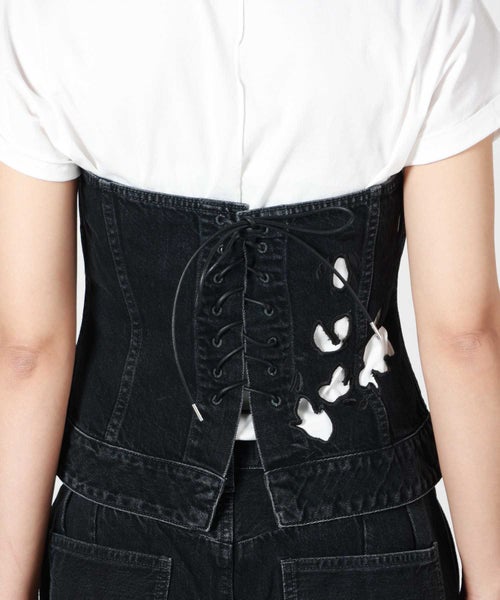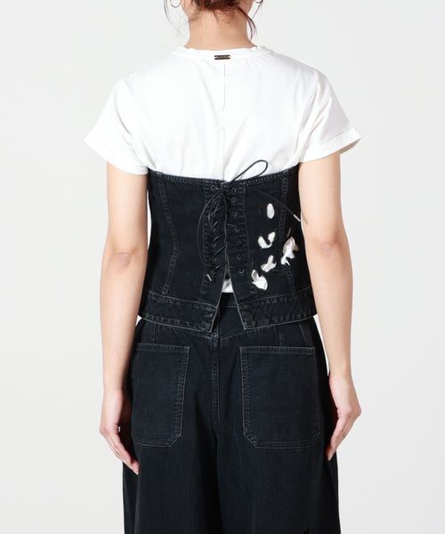 【デザイン】タナカ定番のデニムビスチェをベースに、ブランドならではの大胆なカットワーク刺繍を施したスペシャルモデル。バックはレースアップのディテールがこだわりの1枚。(サイズ調整不可)立体的に浮かび上がるようなカットワークは、唯一無二な存在感を発揮しています。刺繍の最後の仕上げは職人の手作業で行うという徹底ぶりで、時間と技術が注ぎ込まれた逸品です。シンプルなアイテムを合わせるだけで主役になる一本。シャツなどと合わせれば、モードかつ洗練されたスタイルが完成します。