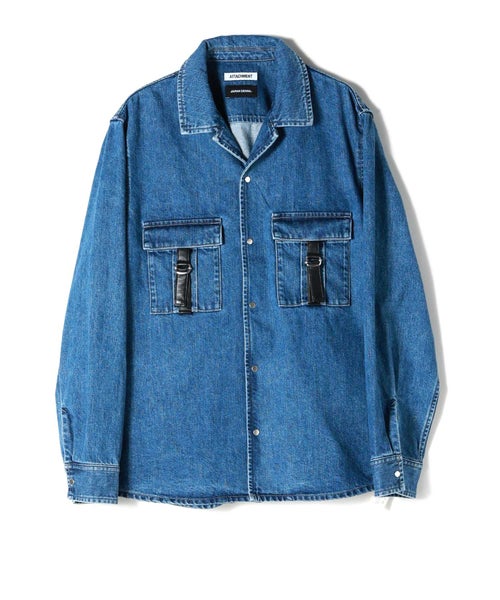 【デザイン】フロントポケットにレザーストラップを施した、存在感のあるシャツジャケット。立体的に構築されたダブルポケットが視線を引きつけ、ミリタリーやワークの要素を感じさせながらも、全体はミニマルにまとめています。ポケットに配したシルバーパーツには、ATTACHMENTデザイナー榎本氏の私物であるヴィンテージロレックスのベゼルから着想を得たオリジナルパーツを採用。控えめながら重厚感のある輝きが、デニムに上品な緊張感を与えます。さらに、サイドシームにもポケットを配置。見た目の美しさを損なわず、実用性を確保した設計です。シャツとしても、軽いアウターとしても活躍する汎用性の高い一着。Tシャツの上に羽織るだけでスタイルが完成する、完成度の高いデザインです。