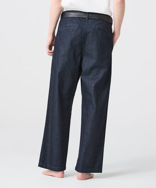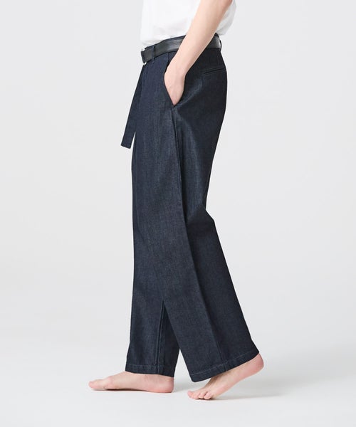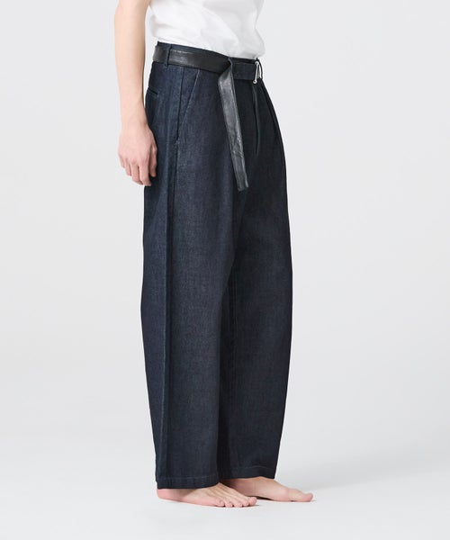 【デザイン】リラックス感のある1タック仕様のワイドシルエット。腰まわりに程よくゆとりを持たせながら、裾にかけてすっきりと整えたバランスで、ラフさと品の良さを両立しています。ワイドながらもだらしなく見えない、美しいラインが特徴です。ウエストにはリアルレザーとデニムを切り替えたベルトを採用。スタイリングや気分に合わせて見せ方を変えられ、コーディネートの幅を広げてくれます。ベルトのシルバーパーツは、ジャケットと共通のATTACHMENTオリジナルパーツを使用。統一感のあるディテールが、セットアップでの着用時にも洗練された印象を演出します。シンプルながら、細部にこだわりを宿したワイドパンツです。