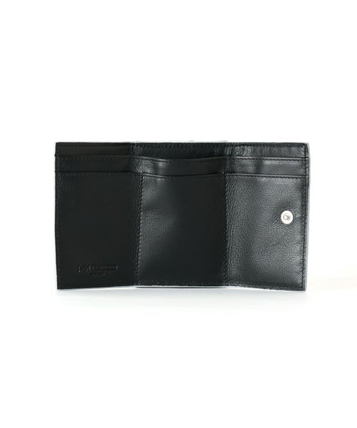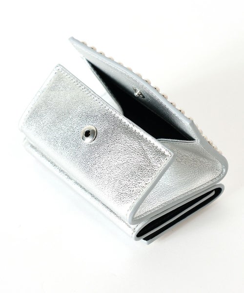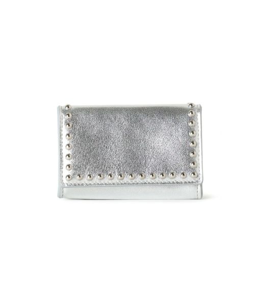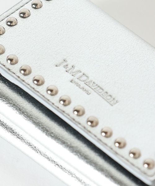 【デザイン】 J&M DAVIDSON (ジェイアンドエムデヴィッドソン)のミニウォレット。両面にスタッズが施された三つ折りタイプのミニ財布。片方にマチのあるコインケース、もう片方にお札を折らずに収納可能なスロットと3つのカードスロットを備え、コンパクトながらも収納性に優れたデザインです。