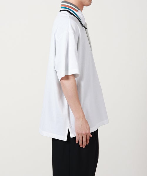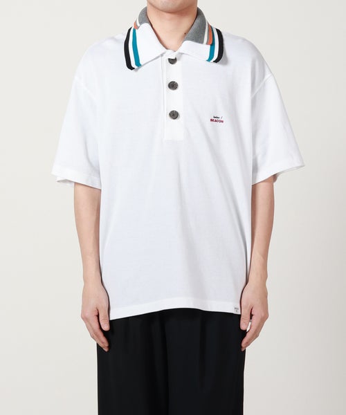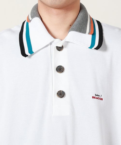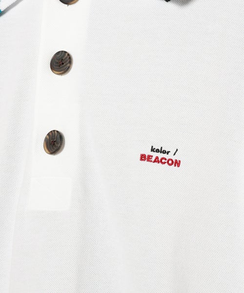 【デザイン】 kolor BEACON(カラービーコン)のデザインポロシャツ。大ぶりのポロカラーはニット素材の異素材切り替えになっており、さらには配色の衿がレイヤードされた、カラービーコンらしい足し算のデザイン。左胸にはシンプルにブランドロゴを配しています。ゆったりとしたボクシーなシルエットの一枚。