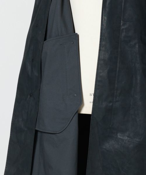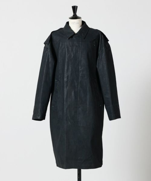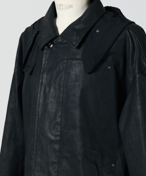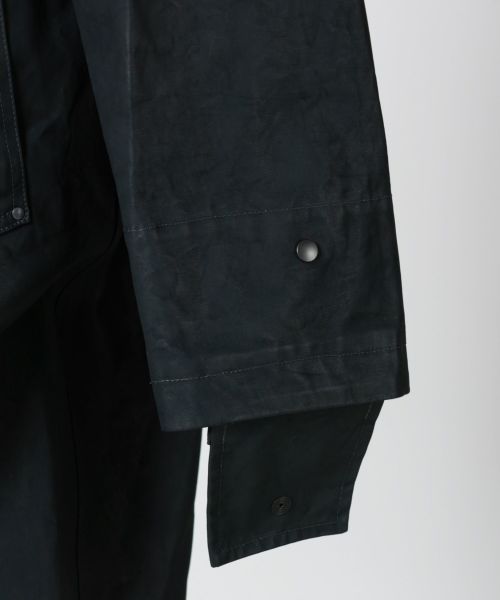 【素材】撥水性のある樹脂加工を施した素材。しっかりとしたハリと適度な柔らかさを兼ね備え、動きに合わせて自然なシワや表情が生まれます。手に取るとややマットな質感ながらも、光の加減でほんのりとした艶が現れ、上質さを感じさせる仕上がり。着用を重ねることで生地に緑青が浮かび、ヴィンテージのような深みのある風合いへと変化します。経年変化を楽しみながら、自分だけの一着へと育てていけるのも魅力。雨風をやさしく防ぎつつ、シーズンを問わず活躍する実用的な素材です。