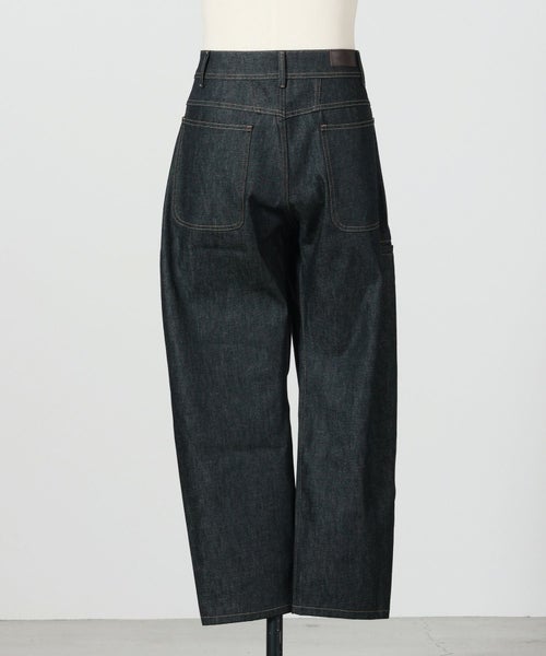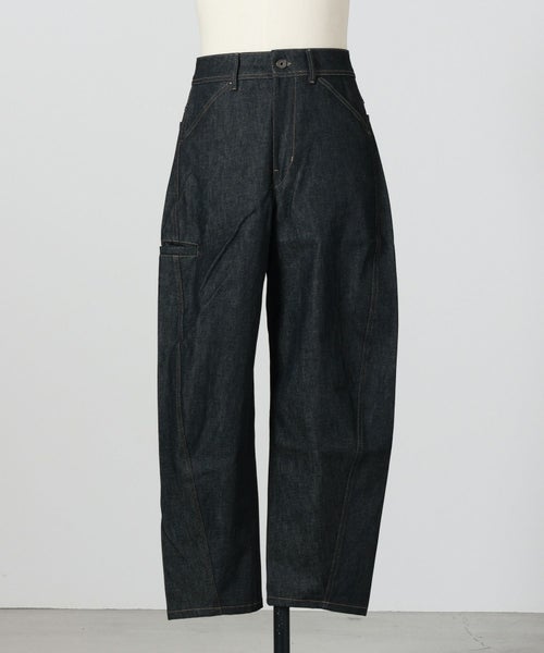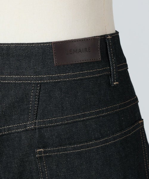 【デザイン】 LEMAIRE(ルメール)のデニムパンツ。LEMAIREの象徴的な定番アイテムであるツイステッドパンツを再解釈したものです。LEMAIREの定番素材であるヘビーデニムを使用し、厚手で丸みのある風合い、ツイル織りの見え方、そして深みのあるインディゴウォッシュが特徴ですサイドシームにツイスト加工を施し、テーパードレッグにわずかにカーブしたボリューム感を与えています。カットはストレートで、膝上のサイドパイピングポケット、バックヨーク、バックに2つのパッチポケットなど。ワークウェアのディテールが施されています。