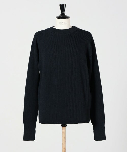 【デザイン】LEMAIRE(ルメール)のニット。フィッシャーマンセーターに着想を得たボクシーシルエットのクルーネックニットは、肩の落ち感が程よく、リラックスした着こなしを叶えます。ネックライン・袖口・裾にはリブ編みを施し、シンプルながらも上品な存在感を放つ一着です。