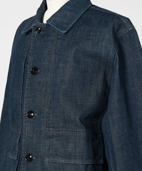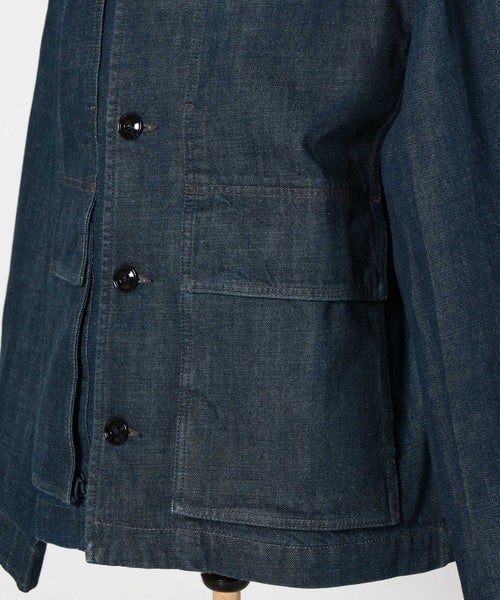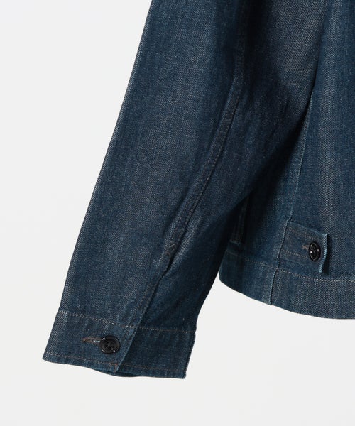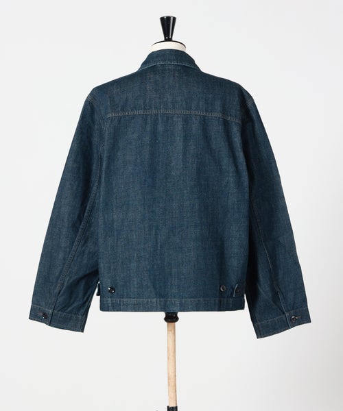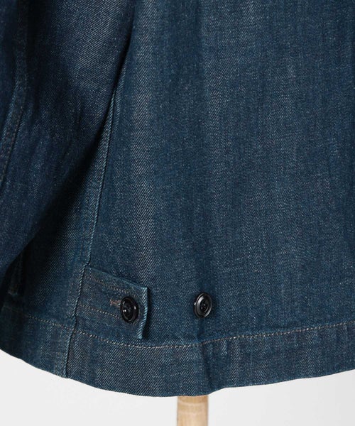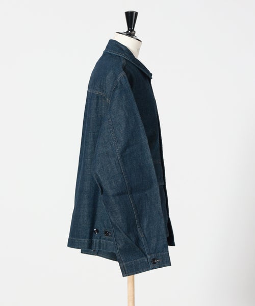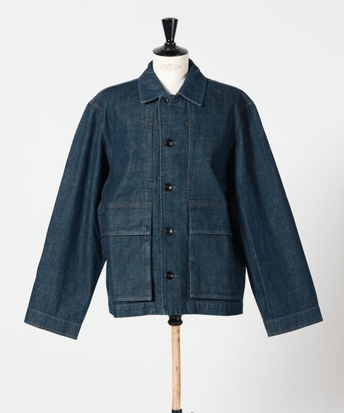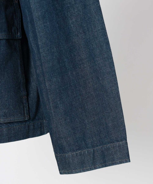 【素材】コットン100%のデニム素材を使用し、しっかりとした生地感とナチュラルな風合いが魅力。程よいハリがありつつも着用するほどに身体に馴染み、経年変化も楽しめます。タフさと快適な着心地を兼ね備え、長く愛用できる一着です。