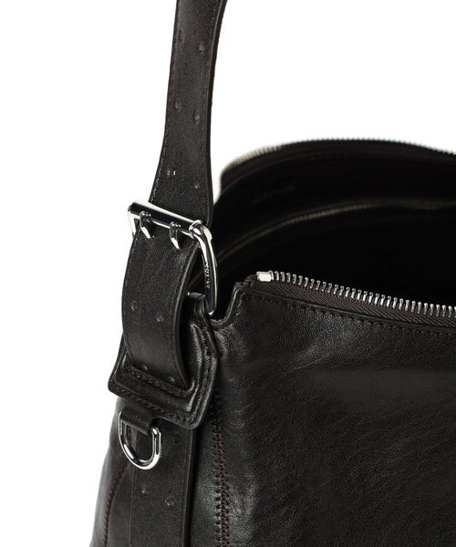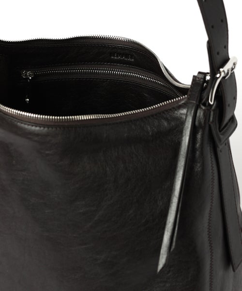 【デザイン】 LEMAIRE(ルメール)のスモールホーボーバッグ。 BELTEDラインは、ミニマルで実用的な精神をもって、アーキタイプ的なフォルムを再解釈しています。ベルトから着想を得た植物タンニンなめしのレザーストラップと、アクセサリーを付けられる小さなDリングなどの光沢のあるメタルパーツによるコントラストが特徴です。 仔牛の革で作られてた、丈夫で光沢のあるレザー ストラップが側面から底まで付いており、補強と構造が強化されています。ユニセックス スタイルのこのバッグは、肩掛けまたは斜め掛けで使用できます。日常使いを想定したデザインで、収納力がありながら洗練され、モダンでミニマルな佇まいを演出します。