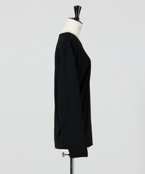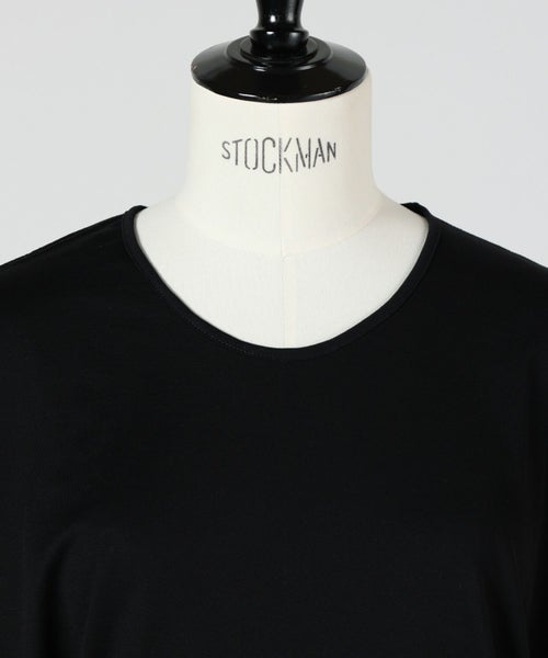 【素材】シルキーな光沢を持つ、上質なコットン100%。軽やかなコットンジャージー素材を使用し、さらりとした肌触りが特徴。マーセライズ加工を施すことで、シルクのような上品な光沢が生まれ、カジュアルながらもエレガントな雰囲気を演出します。適度な厚みがあり、1枚で着ても透けにくく、インナーとしても活躍。着るたびに馴染んでいく、柔らかな風合いも魅力のひとつです。