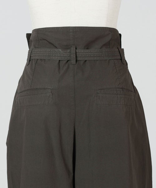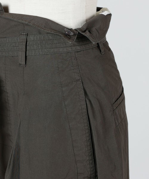 【デザイン】LEMAIRE(ルメール)のパンツ。ボタン留めの折り返し式ウエストバンドとボタンフライが最大の特徴です。共布のバックルベルトでフィット感を調節可能。トレンチコート風のトップステッチが施された両サイドシームポケットと、バックにはウェルトポケットを2つ備え、機能性を高めています。全体に施された同系色のトップステッチが、全体のスタイルを洗練させたパンツです。