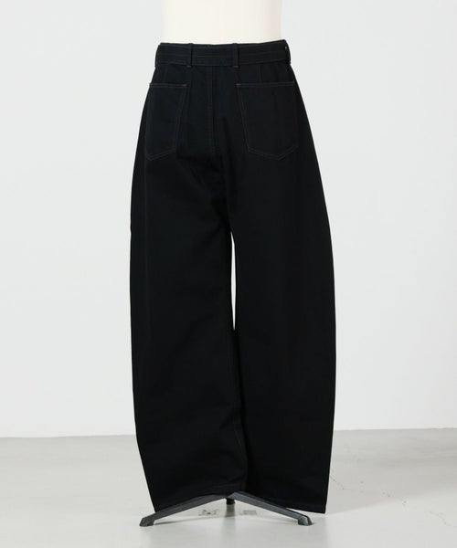 【素材】 厚みのあるヘビーデニムを使用し、しっかりとしたツイル織りが特徴。深みのあるブラックウォッシュが洗練された印象を与えます。手触りはしっかりとした質感ながら、着用するほどに馴染み、こなれた風合いに変化。デニム特有の耐久性があり、長く愛用できるのも魅力。経年変化を楽しみながら、自分らしい一本に育てていくことができます。