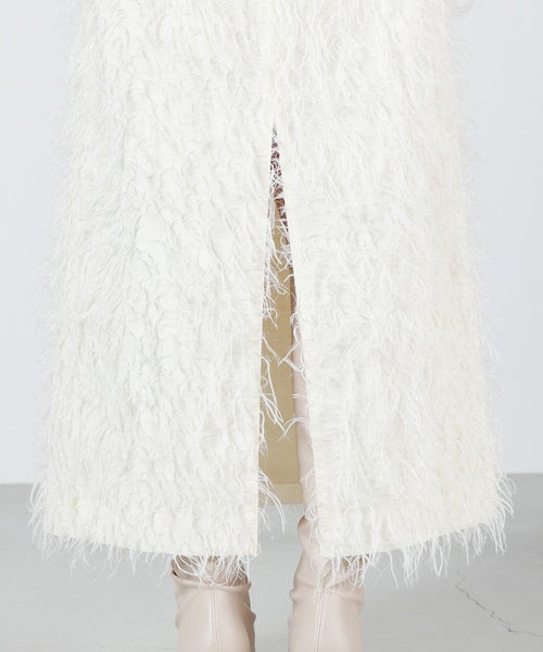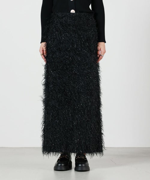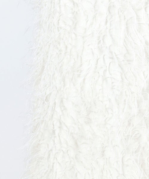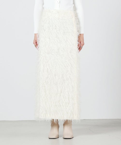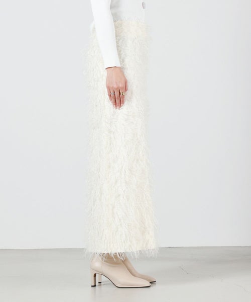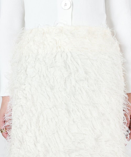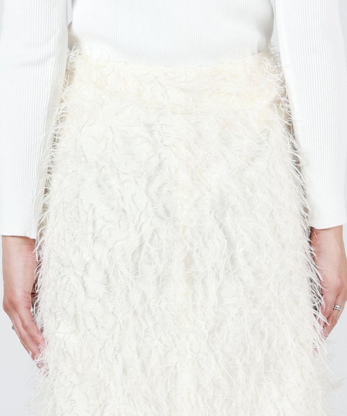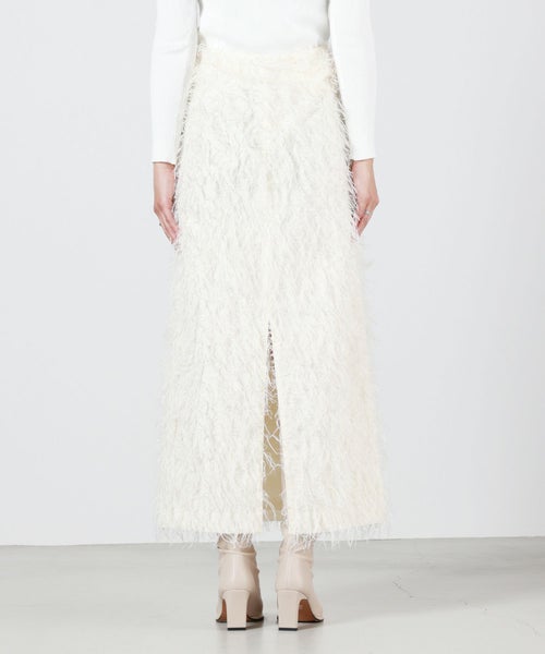 【デザイン】 MADISONBLUE(マディソンブルー)のスカート。全体にあしらわれたフリンジが華やかなアイテム。一見Iラインのようにも見えるスカートですが、後身頃のスリットによって生まれる緩やかなAラインを生み出し、すっきりとした印象を与える甘すぎないシルエットが魅力です。