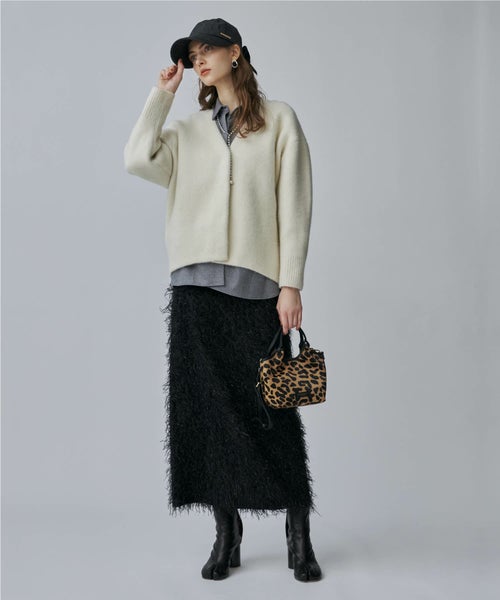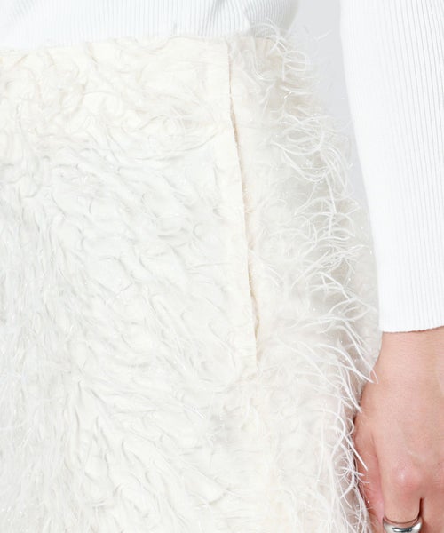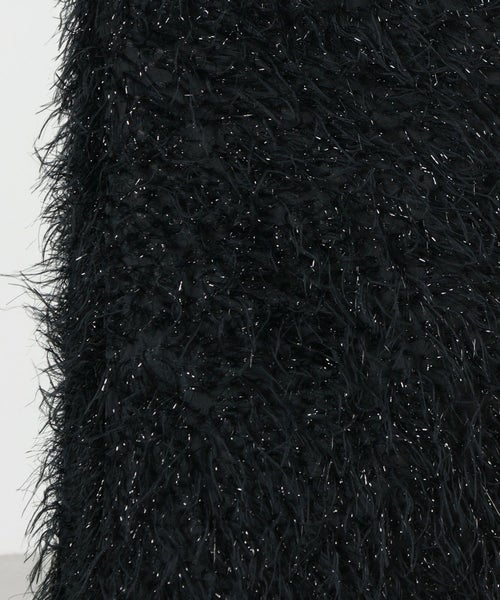 【素材】 先染めのジャガード織りの毛足を長くカットしてフェザーのようなフリンジを作ったフランス製の生地。フリンジにラメ糸を織り込むことでシャイニー感のある仕上がりに。