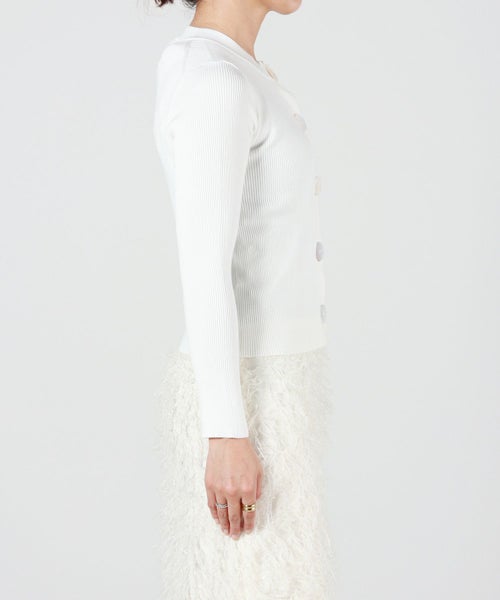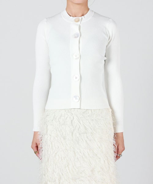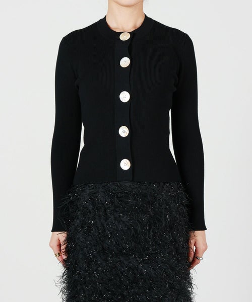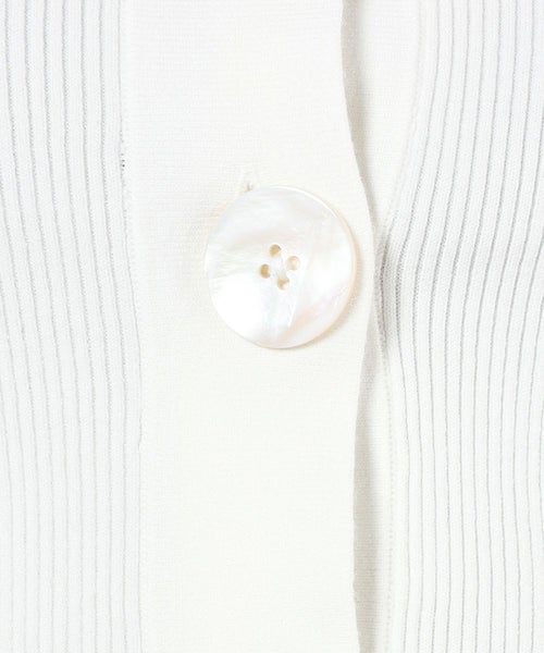 【デザイン】 MADISONBLUE(マディソンブルー)のニットカーディガン。フロントに配されたアクセサリーのような大きなボタンがエレガントな雰囲気を放つアイテム。コンパクトながらもインでもアウトでも着用できる丈がポイントです。