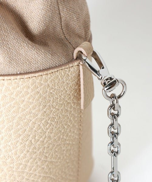 【デザイン】Maison Margiela(メゾンマルジェラ)のレザーとキャンバスを採用した5ACバケットバッグ。 トップハンドルと取り外し可能なチェーンショルダーストラップが備わります。アイコニックな5ACのネーミングは、フランス語でバッグを意味するSacに由来しています。メゾン マルジェラの「ライニングの匿名性」の概念を反映して、クラシックなシェイプのハンドバッグのライニングを引き出したデザインが特徴です。ライニングにあしらわれたナンバリングのロゴがポイント。手作業によるメタルリベットの革張り、トーナルカラーでハンドペイントされたエッジに職人技が見て取れます。
